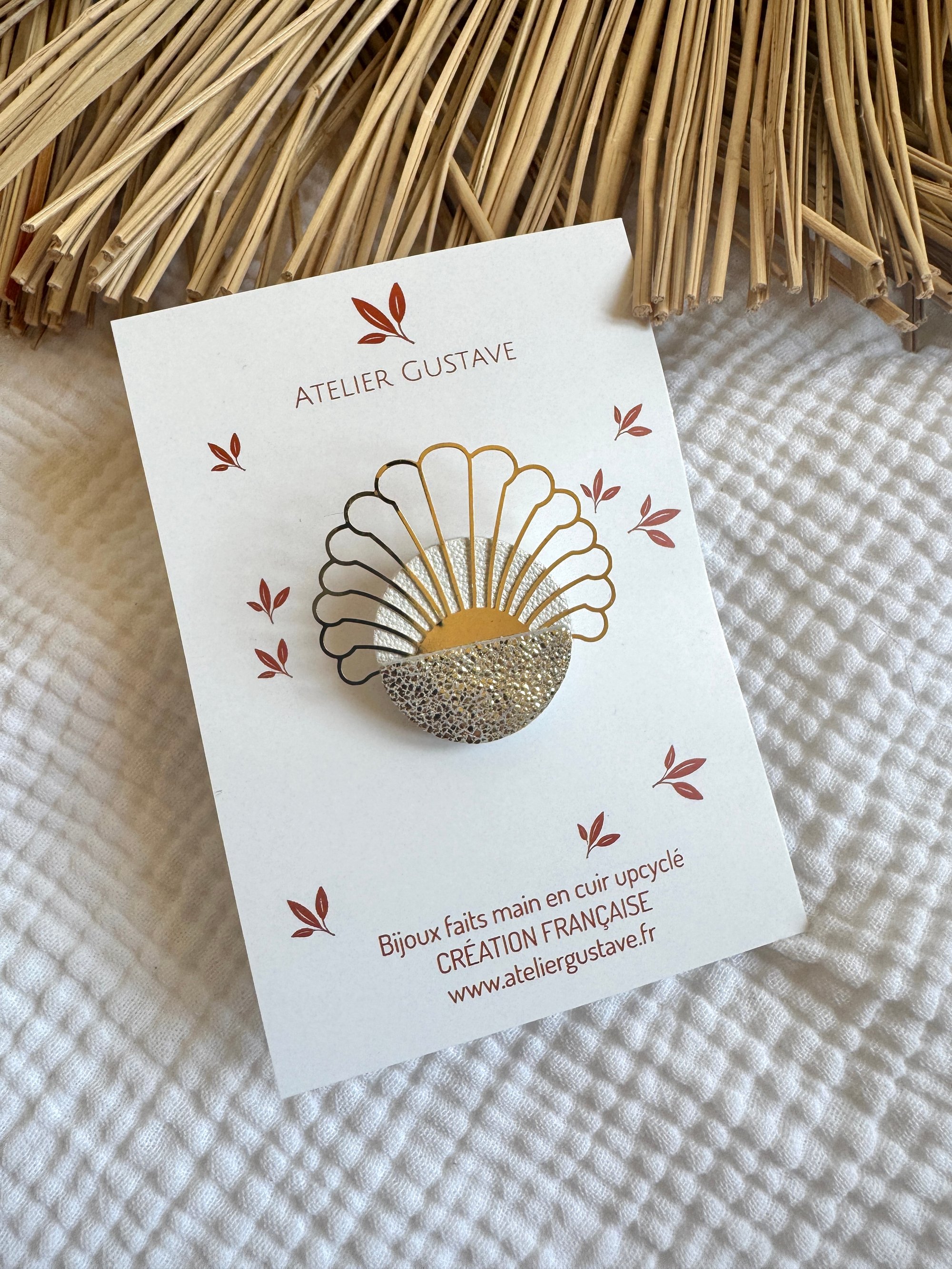 Une jolie dentelle en métal doré et du cuir de luxe pour cette jolie broche dans un esprit coucher de soleil …