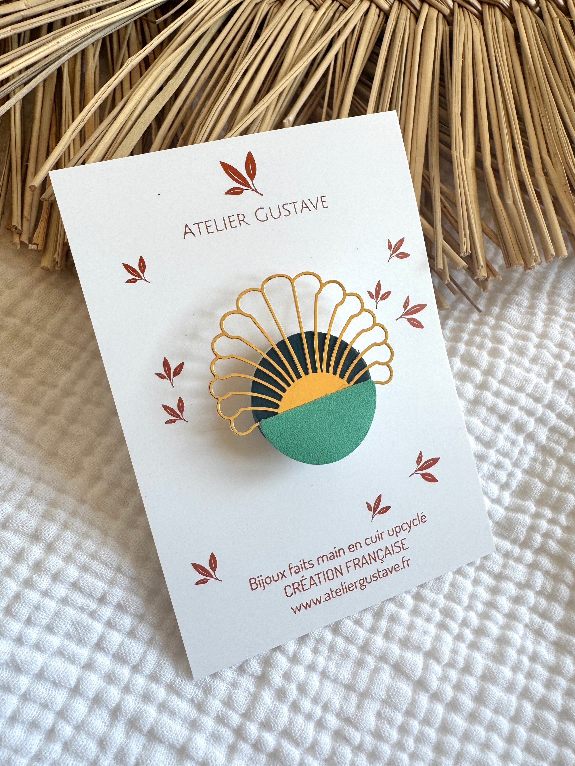Une jolie dentelle en métal doré et du cuir de luxe pour cette jolie broche dans un esprit coucher de soleil …