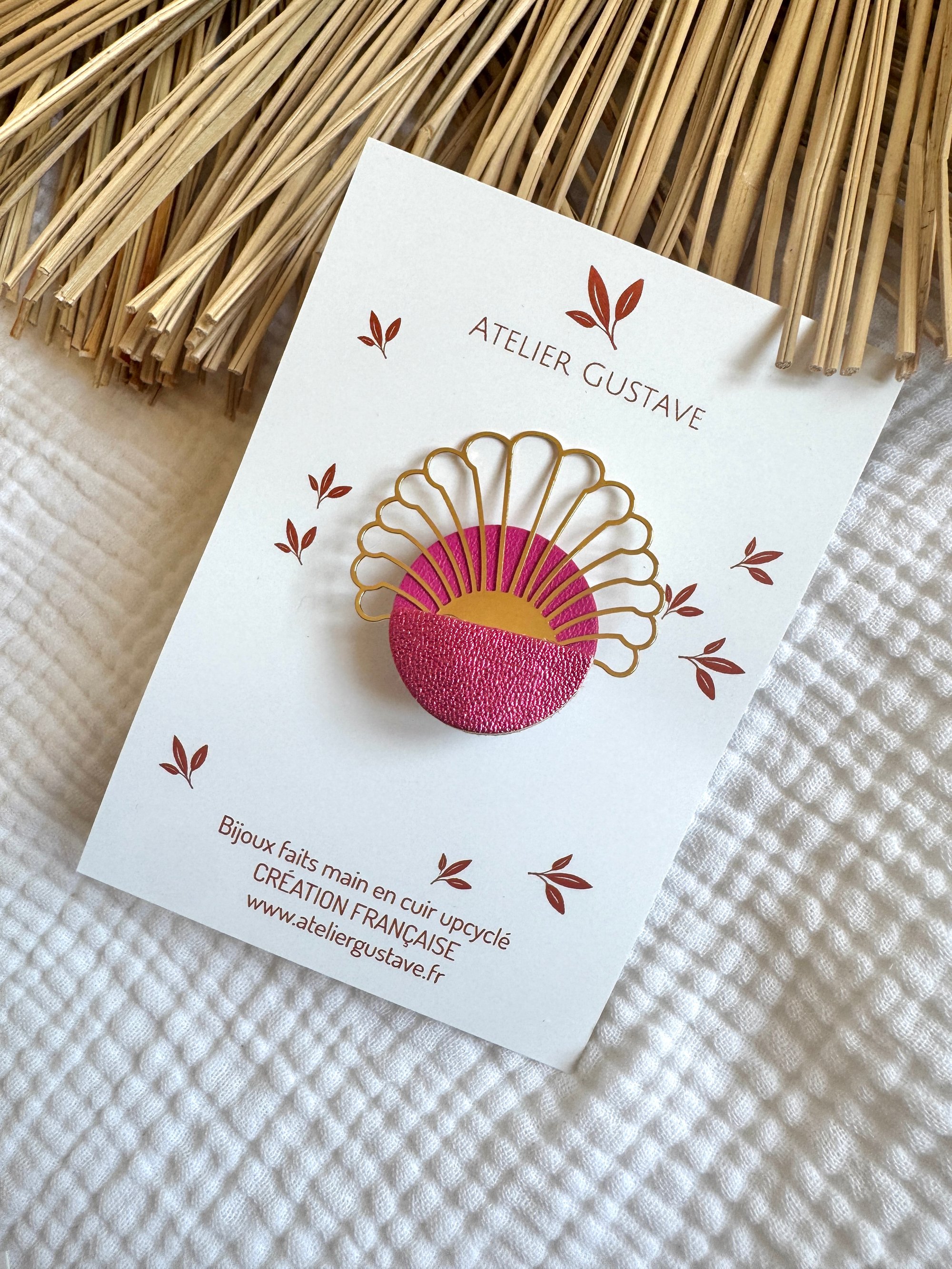 Une jolie dentelle en métal doré et du cuir de luxe pour cette jolie broche dans un esprit coucher de soleil …
