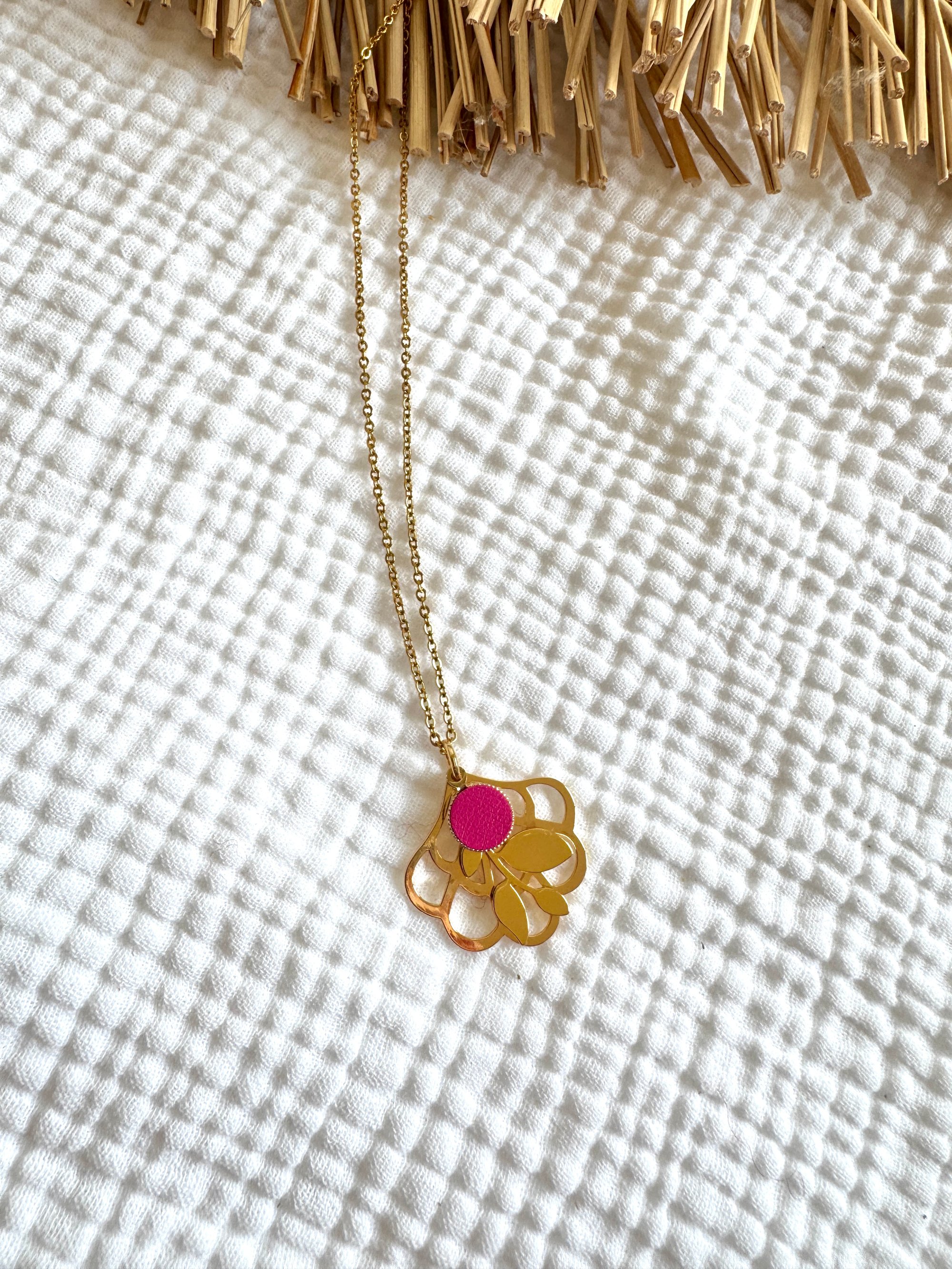 ♡ Collier court avec chainette de réglage, pendentif floral avec pièce de cuir
