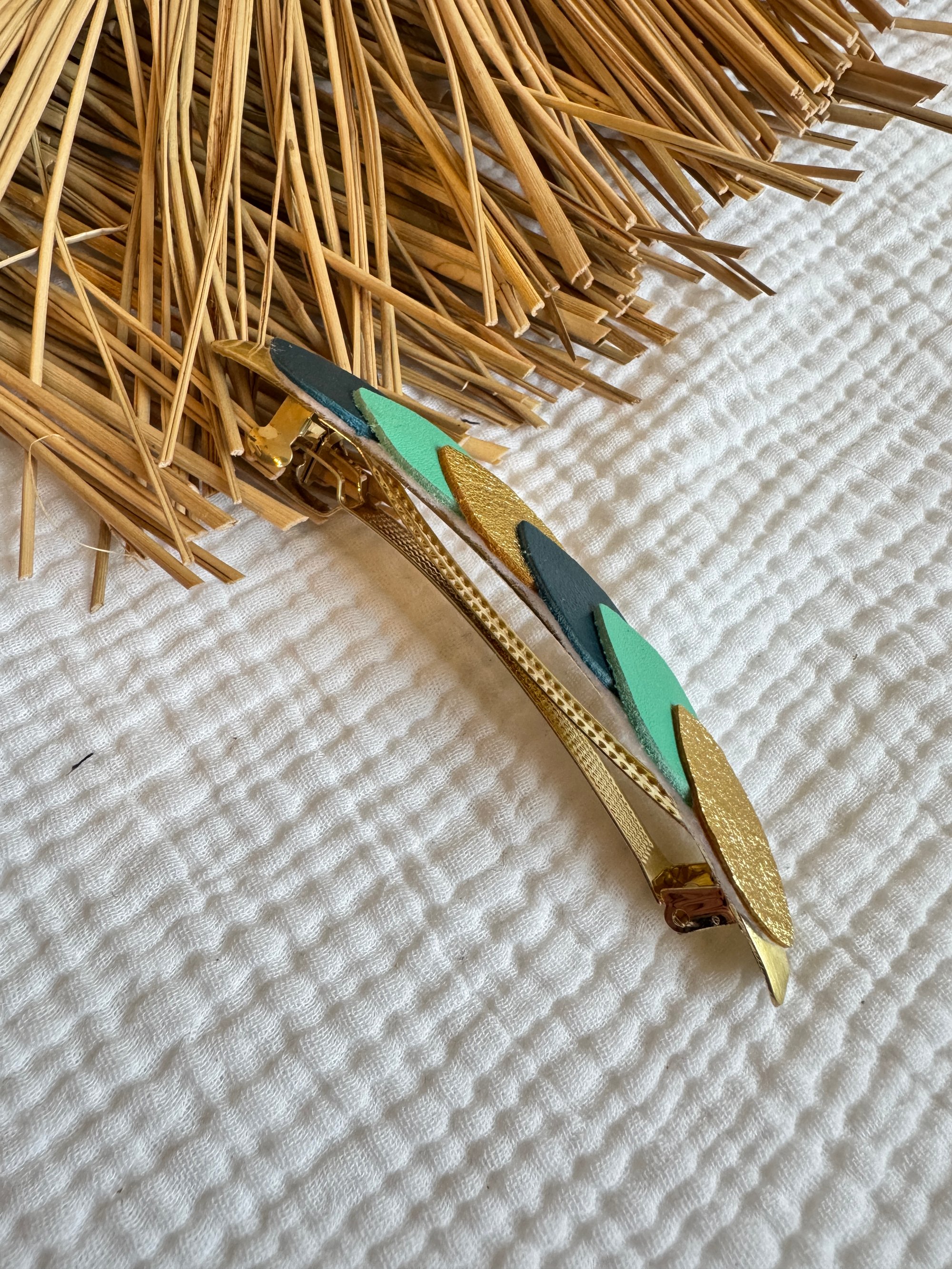 ♡ grande barrette queue de cheval avec des pétales de cuir dans un joli camaieu